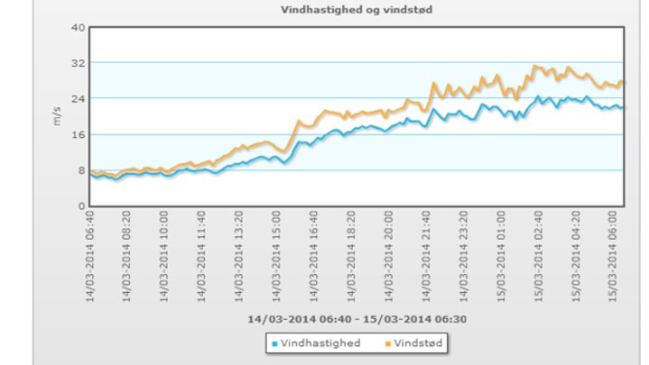 På mange målestationer blev middelvinden observeret tæt på 24 m/s, hvilket er 1 m/s fra at vi har oplevet reel storm.