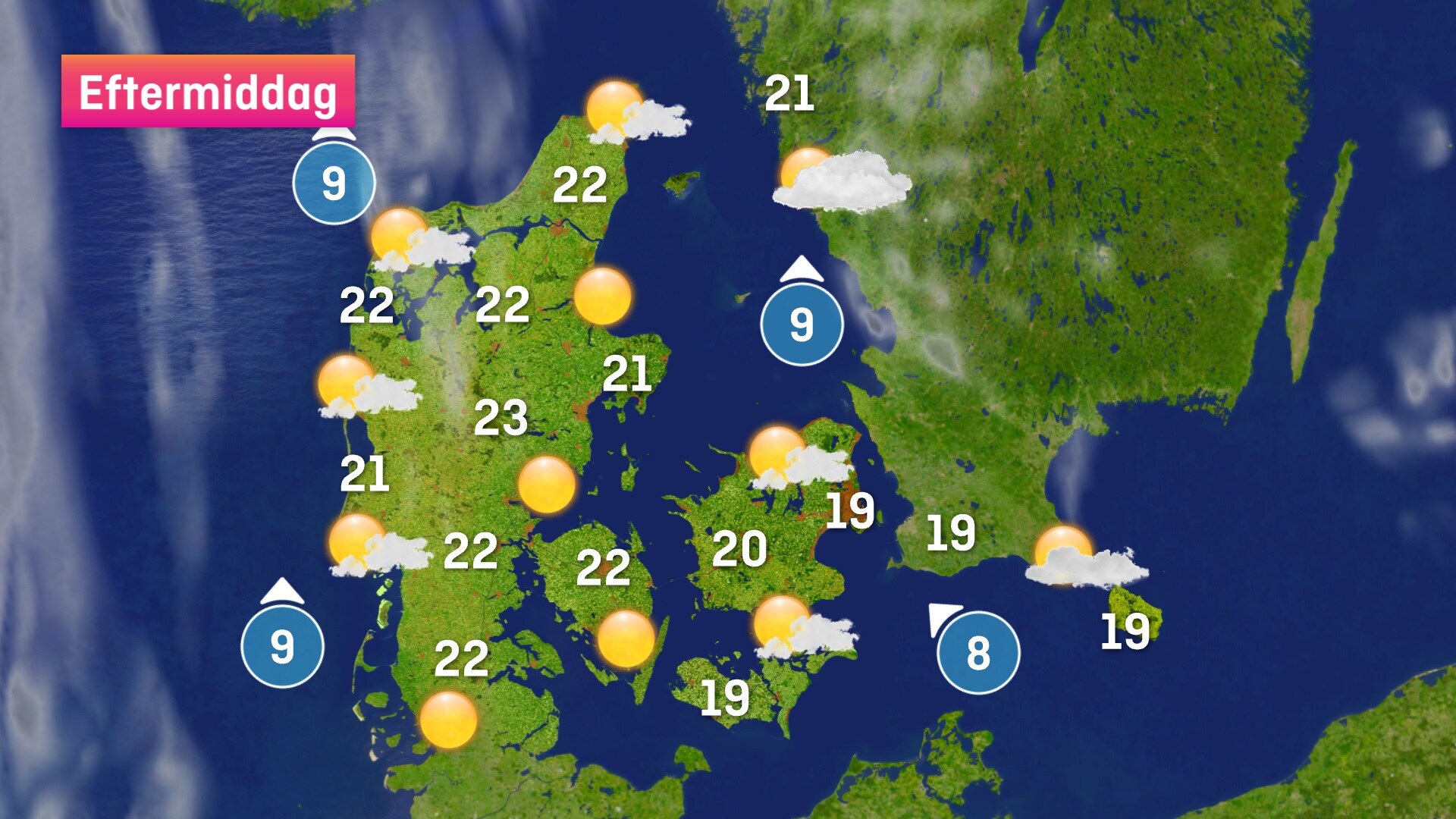 I eftermiddag stiger temperaturen til 17 - 22 grader, måske endda 23 grader fx i det Midtjyske. Vinden rør lidt mere på sig i dag i forhold til i går, vi kommer op på en let til frisk vindstyrke fra syd og sydøst.