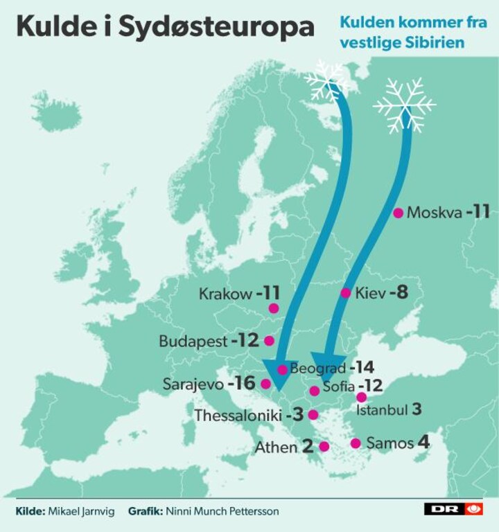 Ifølge Mikael Jarnvig er kulden meget usædvanlig for netop Sydeuropa. Her har den raset i blandt andet Grækenland og Italien, og italienske myndigheder kunne i torsdags fortælle, at syv personer var omkommet af kulden, de fleste hjemløse.
