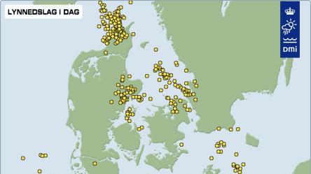 Mens regnen fordelte sig med mest til Østjylland og mindst til de sydlige egne, så var det lidt anderledes med lynene. Hele søndagen kom der 1577 lyn over og nær Danmark og 438 lyn natten til mandag.