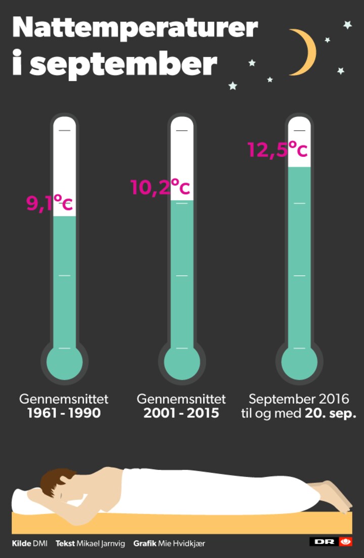 Og hvis du synes, at nætterne har været lune - indtil nu - så er det helt rigtigt. Nattemperaturerne har indtil den 20. september været 2,3 grader højere end gennemsnittet for de seneste 15 års nætter i september.