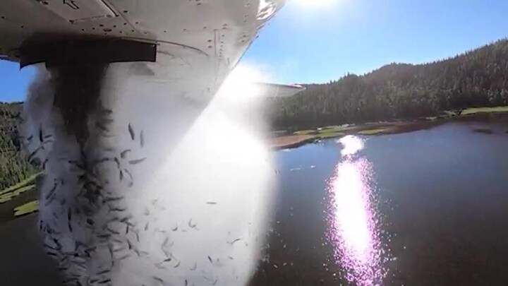 Lige nu bliver en video af et lille fly, der kaster tusindvis af levende fisk ned i en sø, delt på de sociale medier. Det er ren fiske-konfetti.