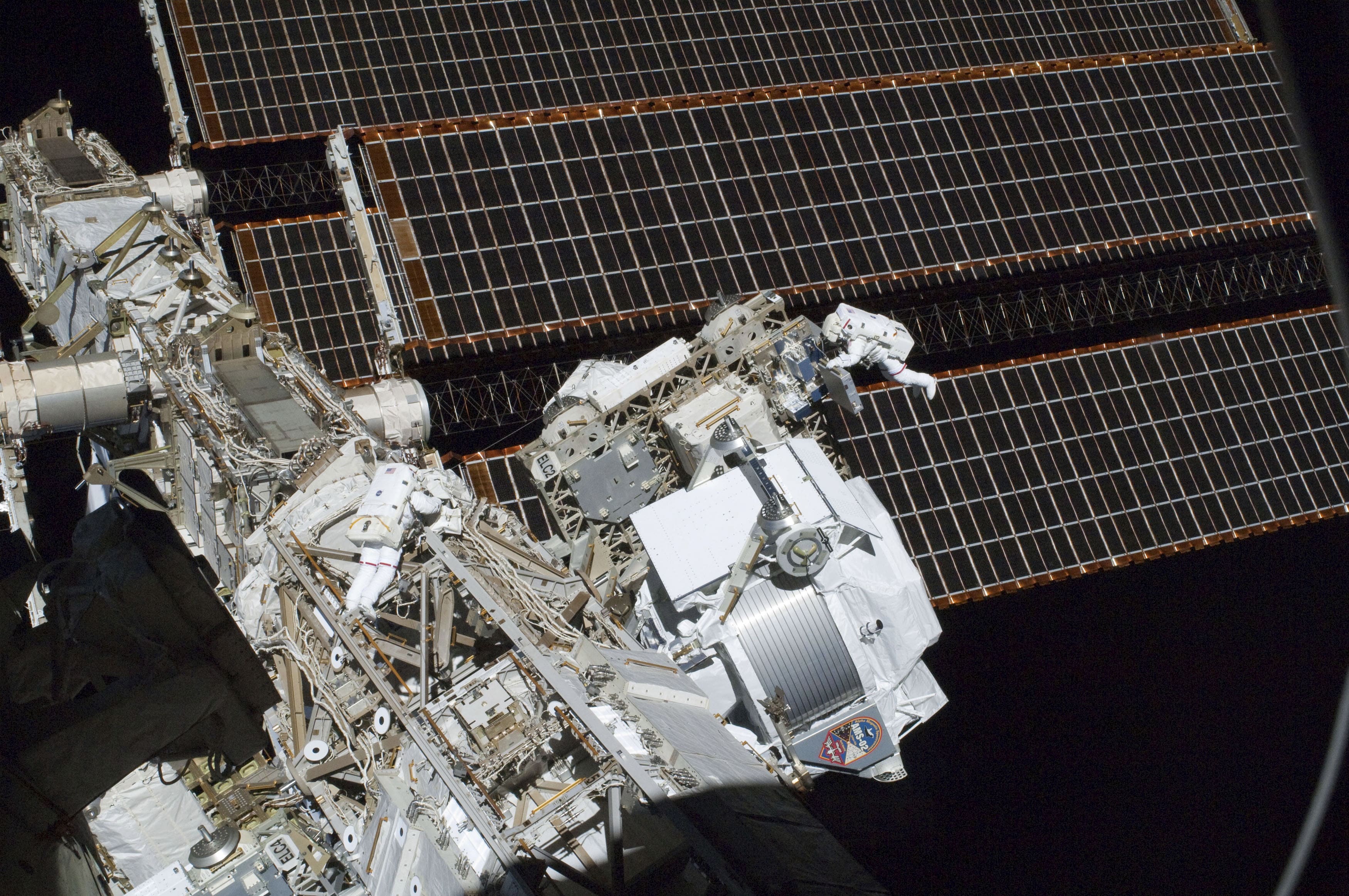 Rumstationen udbygges løbende. Her er astronaterne Andrew Feustel (th) og Greg Chamitoff (tv) midt i deres første rumvandring, for at skrue nye dele på ISS tilbage i 2011. (Foto: © Nasa, Scanpix)