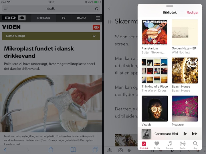 I første hug vil den app, du trækker ind, lægge sig som en app, der ‘flyder’ oven på den, der var åben - det kaldes også ‘slide over’. Ønsker du, de to apps skal vises side om side, skal man efterfølgende trække ned i appen, der flyder.