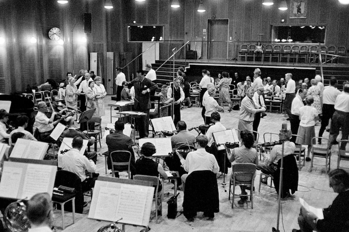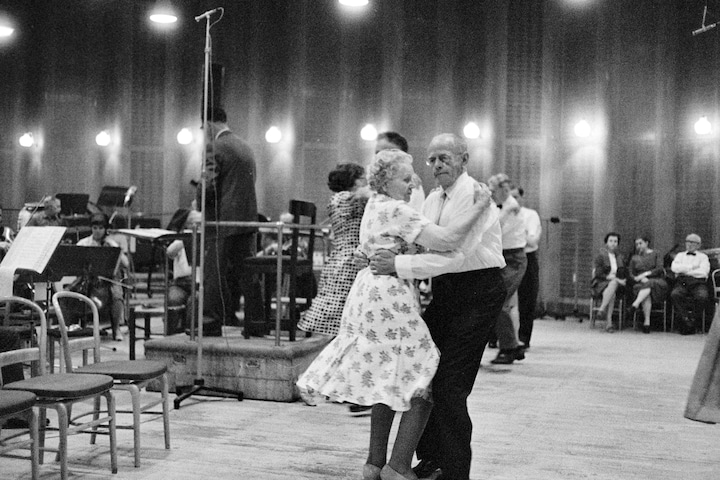 Fotografiet her er fra 1953. Billedet viser DR Underholdningsorkestret i Studie 2, dirigeret af Teddy Petersen. Læg mærke til de ældre mennesker, der danser folkedans. Billedet er taget under optagelserne til serien ’Ældre Dansemusik’, som blev udsendt i radioen igennem syv årtier helt op til 1980’erne. Foto: DR Arkiv.1 / 4