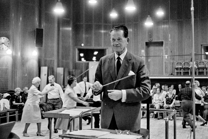 Teddy Petersen havde en lang musikalsk karriere i både USA og på forskellige danserestauranter i København, blandt andre Wivex, inden han blev ansat i Statsradiofonien. Allerede fra 1927 optrådte han i radioen som dirigent for Paladshotellets Orkester. Men fra 1944 begyndte han at dirigere det orkester, der i starten hed Radio-Ensemblet. 1. april 1949 skiftede ensemblet navn til Underholdningsorkestret. Teddy Petersen fortsatte i DR helt frem til sin afskedskoncert den 23. november 1985, hvor han dirigerede Radiounderholdningsorkestret - 93 år gammel. Foto: DR Arkiv.4 / 4