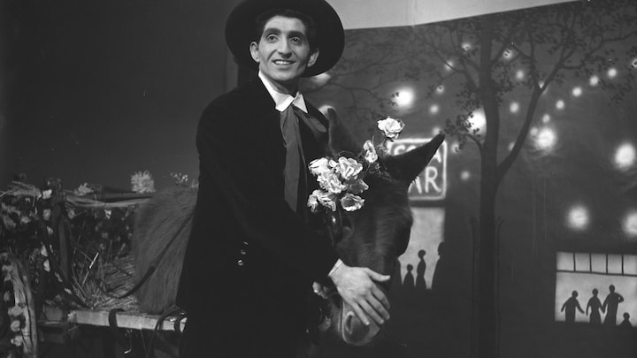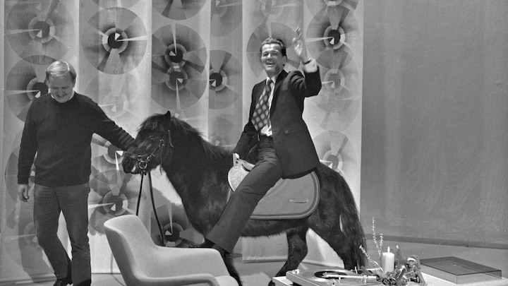 Levende dyr i studiet var mere almindeligt førhen, og også her havde Otto Leisner sit at bakse med i 'Pladeparade. Da Rudi Marino i 1958 skulle synge sin 'Æselsang' lejede DR et æsel hos rideudlejningen ved Peter Lieps Hus i Dyrehaven i Klampenborg. Æslet opførte sig eksemplarisk under prøverne, men det blev helt balstyrigt under den direkte udsendelse, så sangeren måtte holde det krampagtigt i hovedtøjet og havde svært ved at koncentrere sig om at synge. På det tidspunkt var det ikke rigtig muligt at optage udsendelserne på bånd, så de blev sendt live. (Foto: © Dr arkiv)12 / 16