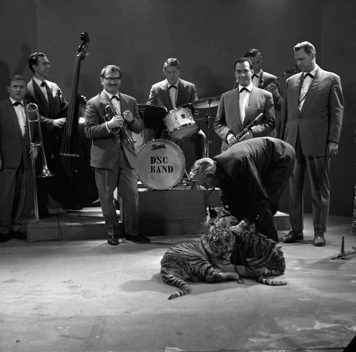 En ting, der ikke ville gå i dag, var, at der var tigre i DR's studier. Det var der i Radiohusets Studie 5 på Frederiksberg, da DSG Band optrådte den 12. december 1960. (Foto: © Dr arkiv)13 / 16