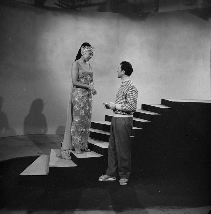 Sådan så det ud, da det i 1958 lykkedes Otto Leisner at indfange verdensstjernen Josephine Baker til 'Pladeparade'. Han skriver i sin bog, at han var meget nervøs for at møde hende, fordi han var kommet til at annoncere hende på et forkert tidspunkt, da hun i sin tid skulle optræde på National-Scala i København. Det kunne hun godt huske, men lovede dog alligevel at stille op. Her er Otto Leisner i en for seerne ganske usædvanlig påklædning: islændersweater og sandaler. (Foto: © Dr arkiv)9 / 16