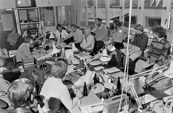 Forholdene på TV-Avisen var unægtelig anderledes dengang i 1980'erne – her er et billede fra en tid, hvor både Lasse Jensen, Peter Olesen, Hans V. Bischoff, Werner Hessenschmidt, Jette Sachs Bostrup og Herdis Mortensen for eksempel arbejdede på redaktionen . og hvor der fejres fødselsdag. Hans V. Bischoff blev også anerkendt af DR for sit sprogbrug, for i 1991 blev han modtager af DR's Sprogpris. I en årrække var Hans V. Bischoff også formand for Publicistklubben. (Foto: © Bent Paulsen)6 / 10