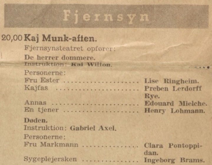 I de første år i 1950’erne var det sparsomt, hvor mange teaterforestillinger, der blev opført i fjernsynet, og det var især det folkelige teater, som for eksempel komedier, der blev transmitteret. Men også Kaj Munks enakter-forestillinger fandt vej til fjernsynsskærmen. For eksempel opførte man den 30. marts 1956 to korte stykker af Kaj Munk, ’De Herrer Dommere’ - instrueret af Kai Wilton, og eventyret ’Døden, instrueret af Gabriel Axel. Udsendelsen blev sendt live og er ikke bevaret, men fotografier fra de to tv-spil kan ses øverst i artiklen.