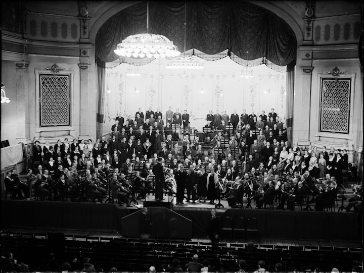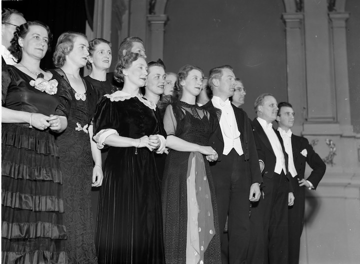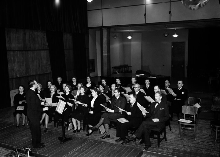 På få år opnåede DR Koncertkoret et forbløffende niveau. DR Symfoniorkestrets tyske gæstedirigent Fritz Busch var begejstret for mulighederne ved at have et stort kor tilknyttet orkestret, og da han i 1934 opførte Beethovens 9. Symfoni (med den store korfinale 'Ode til glæden'), bad han korsangerne om at lære musikken udenad, så de kunne optræde uden noder. Det lykkedes – og Fritz Busch udtalte efter koncerten, at DR Koncertkoret var 'verdens bedste kor'. Billedet er taget i Odd Fellow Palæet ved en af prøverne, for korsangere er klædt i hverdagstøj – og står uden noder. (Foto: © Dr arkiv)3 / 11