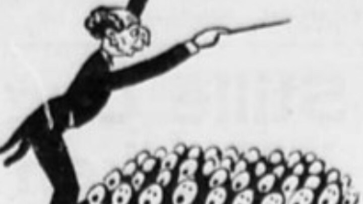 DR Koncertkoret debuterede med en dødsmesse. Det foregik 1. april 1932, hvor DR havde stablet en opførelse af Verdis gevaldige Requiem på benene, dirigeret af italieneren Egisto Tango. Et stort kor var påkrævet, og man samlede for første gang et radiokor af professionelle danske sangere. Pressen rapporterede på forhånd, at DR havde skabt 'et monsterkor'! Men hvad der kunne være blevet en rodet debut blev i stedet 'en mesteropvisning, der klang enestående skønt', som en anmelder skrev. Vittighedstegningen blev bragt i Politiken inden koncerten. Vi beklager den dårlige gengivelse af tegningen.2 / 11