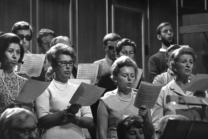 Det oser af 1960’erne på dette foto af DR Koncertkoret, taget i Radiohuset 1969. Det store koncertkor har gennem årene været brugt i flere undergrupperinger til opgaver, hvor man af musikalske grunde foretrækker et lille kor fremfor et stort. På dette tidspunkt hed den lille version Radiokammerkoret. Tidligere kaldte man det Madrigalkoret (med speciale i tidlig musik). I dag har man DR Vokalensemblet med 18 fuldtidsansatte sangere, som indgår i DR Koncertkoret, hvor de 56 øvrige sangere er deltidsansat. (Foto: © Dr arkiv)6 / 11