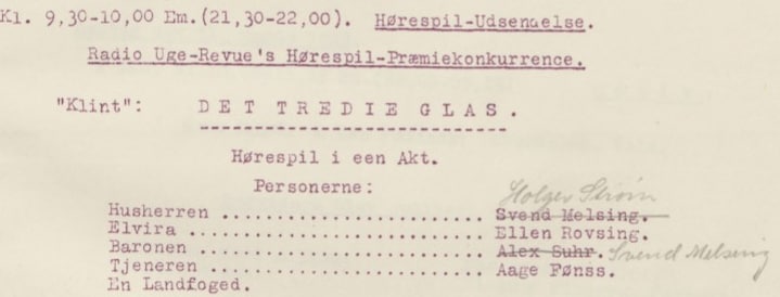 Derfor havde Statsradiofonien allerede i 1928 udskrevet den første hørespilkonkurrence, som blev vundet af Viggo F. Møller med hørespillet ’Det tredje glas’. Det blev det første nyskrevne hørespil til radioen, og det blev udsendt 30. marts 1928: