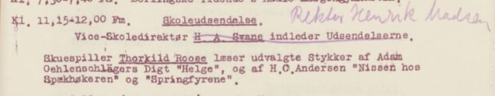 Fra Skolens Side har vi derfor krævet af Radioen og delvis faaet gennemført, at Udsendelserne til Skoler og til Børn støttes af Tryksager, der giver illustrerede Oversigter over det Stof, der bringes. Det lille Blad ’Hallo, Hallo’ har efter min Mening store Muligheder for at opdrage Børnene til at blive gode Lyttere.
