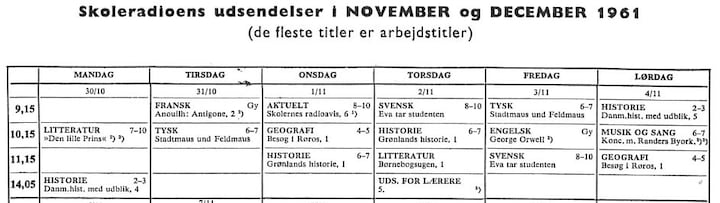 Man kan se af de skoleskemaer, der blev sendt ud i DR’s årsberetning i 1960, at skoleradioen blev planlagt til at passe ind i børnenes skoledag. Bare en enkelt uge i efteråret 1961 ses her: