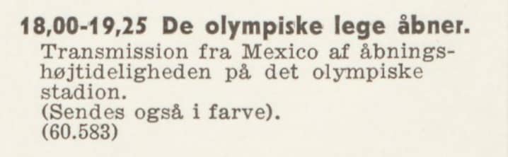 I 1968 blev De Olympiske Lege holdt i Mexico. Det var første gang, at man transmitterede sommer-OL i farver (vinter-OL i Grenoble i 1968 var allerede tyvstartet med farverne), så hvis man var den glade ejer af et farvefjernsyn, kunne man opleve sportsudøverne på en helt anderledes levende måde. Danmarks Radio var først begyndt at eksperimentere med farve-optagelser i starten af 1968, og der kan ikke have været mange seere, der ejede et tv-apparat, som kunne vise farver. Men så gik folk hen for at se OL i tv-forretningerne i stedet.