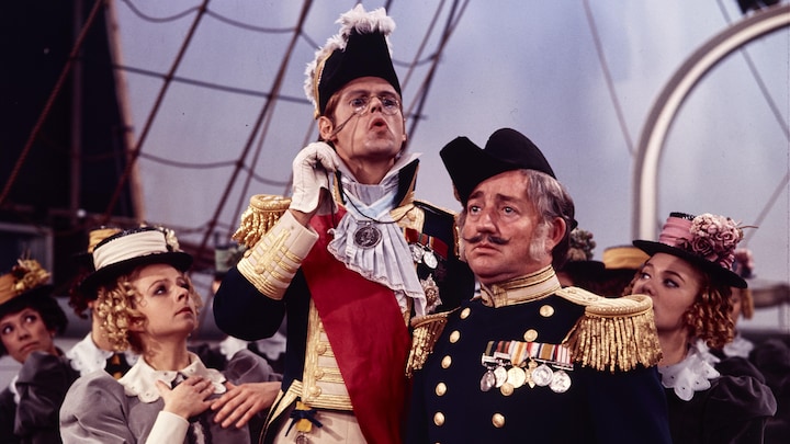 I operetten 'H.M.S. Pinafore', som DR1 viste i julen 1970, spillede Buster Larsen kaptajnen på det gode skib Pinafore. Her spillede han blandt andet sammen med Christiane Rohde og Ulf Pilgaard. (Foto: © Dr arkiv)10 / 14