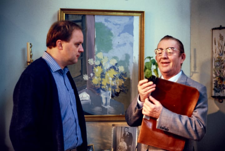 Ebbe Kløvedal Reich og Morten Arnfred skrev tv-spillet 'Tjenstlig frihed'. som DR1 viste i 1984. Her spillede Flemming Jensen sammen med Buster Larsen. Ulla Jessen, Otto Brandenburg og Kirsten Rolffes havde nogle af de andre hovedroller. (Foto: © Valdemar Vedel)12 / 14