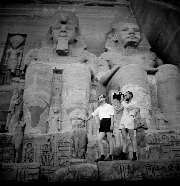 Det er ikke kun danmarkshistorien, der er blevet fortalt af Piet van Deurs. Templet Abu Simbel i Egypten lå i vejen for den regulering af Nilens løb, som landets leder, Gamal Abdel Nasser, ønskede for at fremme landets udvikling. UNESCO organiserede i 1964-68 en flytning af templerne. Figurerne blev savet i stykker og flyttet 60 m op og 210 m ind i landet. Piet van Deurs og et dansk filmhold fulgte arbejdet. (Foto: © DR Arkiv.)5 / 9