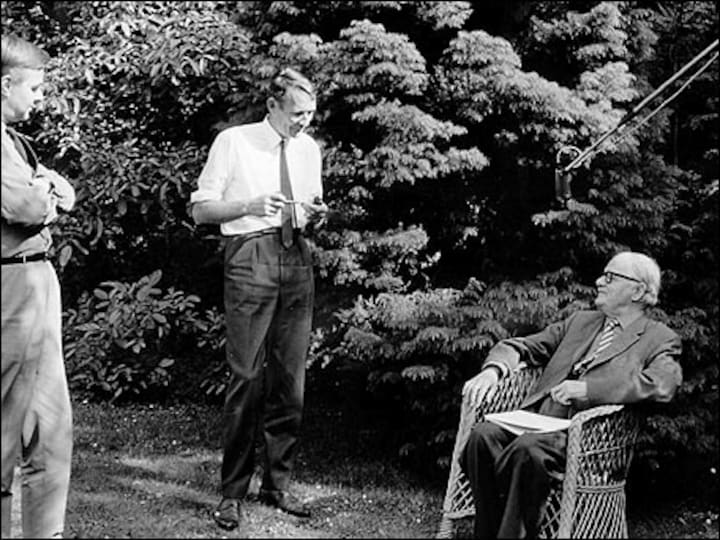 Fra 1964 blev Piet van Deurs ansat i TV-Kulturafdelingen, hvor han var programredaktør og souschef. Her ses han med forfatteren Tom Kristensen under tv-optagelser i dennes hjem på Thurø i 1965. Den tredje mand er Vagn Grosen. (© DR)4 / 9