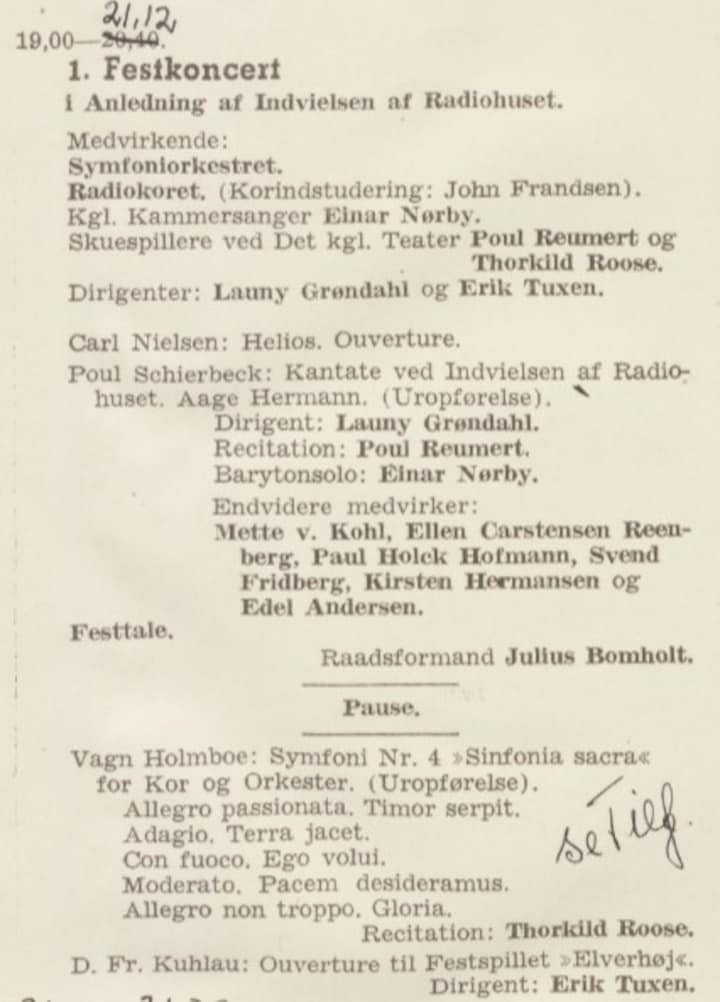 Arkitektfirmaet lod som om, de ikke kunne få fat i de sidste materialer, hvilket var usandt, men tyskerne troede på det. På den måde lykkedes det at flytte indvielsen af Radiohuset, til efter at Danmark igen var frit. Det skete ved en række festkoncerter i Radiohusets Koncertsal i september 1945. Ved alle tre koncerter blev der udelukkende spillet dansk musik - noget der ville have været utænkeligt, hvis indvielsen var blevet gennemtrumfet under den tyske besættelse. Her er programmet fra den første koncert den 11. september 1945: