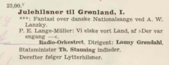 ”Klokken 7 gik jeg saa ned til Nicolajsen for eventuelt at høre nogle af de Juletelegrammer, der da over Kalundborg skulle udsendes til os. Men det blev en Fiasko, desværre, idet de eneste Ord, som vi hørte fuldt forstaaeligt, var Grønlænderen og Pedersen. Gid Pokker har det, naar nu endelig saa stort et Maskineri er sat i Sving.”