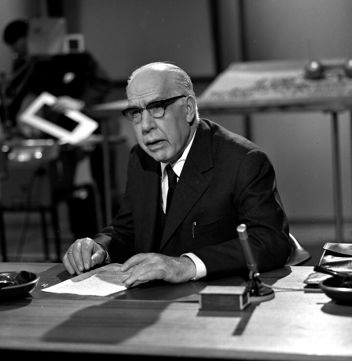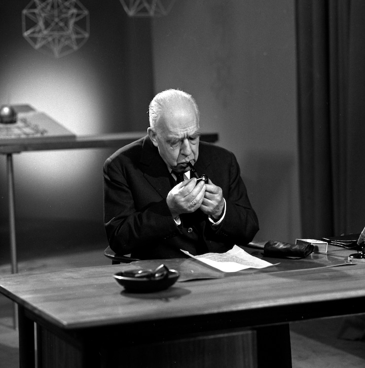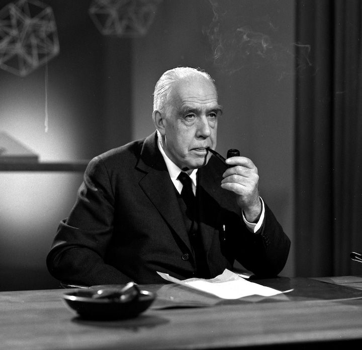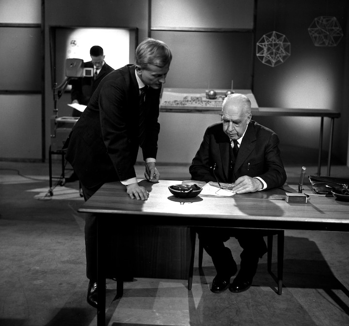Lige nu viser DRTV og DR2 programserien 'Niels Bohrs hemmelighed'. Professoren og atomfysikeren spillede også en central rolle på skærmen for 60 år siden - i 1962. Det var samme år, som han døde i november, 77 år gammel. Foto: DR Arkiv.1 / 8