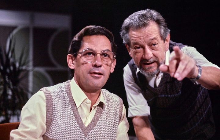 Selv om det ikke nødvendigvis altid var i egen person, Paul Hammerich var på skærmen, satte han massive aftryk på DR's TV-programmer i det hele taget i 1970'erne og 1980'erne. For eksempel var han med til at skrive satireteksterne til underholdningsprogrammerne 'Uha Uha', der var en slags TV-revy. Her er det Buster Larsen, Ulf Pilgaard og Ove Sprogøe fra et af programmerne. (Foto: © DR)6 / 9