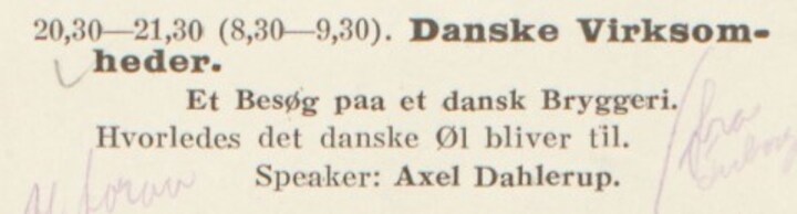 - For at ”skabe lidt Liv” havde vi indlagt en Rolle som en Besøgende, en ”Dr. Bajer”, der fulgte med rundt for at se Bryggeriet. For det første virkede – og var – han overflødig (og det er en stor Fejl i en Radioudsendelse), og dernæst viste det sig, at jo mere han gjorde sig Umage med Fremsigelsen af sine små ”lette” Replikker, des mere mangelfuld blev Balancen mellem hans og vores Tilstedeværelse i Billedet. Den Følelse af Realitet, som vi maatte søge at skabe hos Tilhørerne med vor saglige, nøgterne Samtale, kom han uvægerligt til at spolere med hver eneste Replik, hans Rolle bød ham at fremsige.