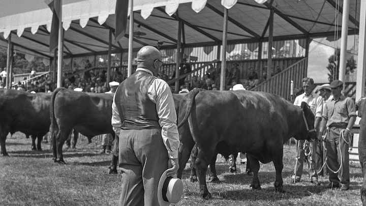 Poul Jørgensen, der senere blev både TV-Avisen-vært og kongelig reporter, blev i mange år kaldt 'Landbrugs-Poul', fordi han lavede programmer om landbruget. I 1970 - og flere andre år - præsenterede han programmet 'I dyrskue-sæsonen', hvor der var reportage fra dyrskuerne i Jyllannd, på Fyn og Sjælland. Billedet her er fra et af de tidligere års dyrskuer på Bellahøj i København. Foto: DR Arkiv. (Foto: © Dr arkiv)5 / 7