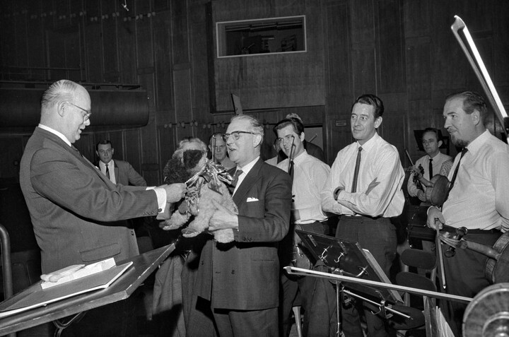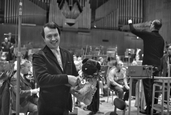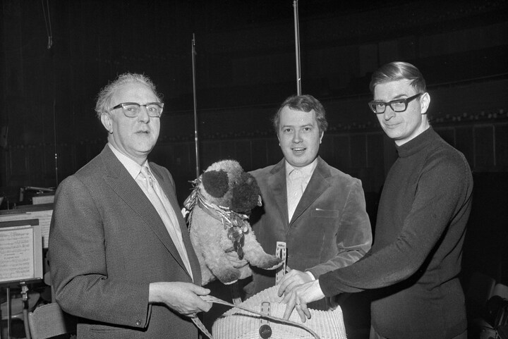 På dette billede fra prøverne inden Radiosymfoniorkestrets turné til Sverige i 1970, ses tv-journalisten Jakob Nielsen sammen med Peddersen. Tøjhunden fik hovedrollen ved en særlig børnekoncert - med journalisten som fortæller. Inden koncerten gik i gang, blev Peddersen sat på en stor spilledåse, og her skulle den agere en af de tre hunde på pengekisterne i eventyret Fyrtøjet. Jakob Nielsen fortalte dog børnene, at hunden også passede på musikken i orkestret.