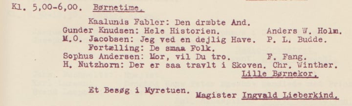 Det første foredrag havde titlen ’Et Besøg i Myretuen’, og det blev sendt den 28. maj 1926 i børnetimen fra klokken 17 til 18. Vi har kun programoversigten af denne udsendelse, men titlen siger meget om Lieberkinds formidling. Det var ikke et foredrag om myren, det var et besøg: Børnene skulle forestille sig, at de var med i skoven. De sad ikke i skolestuen.