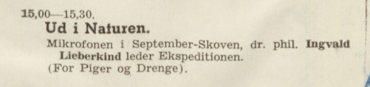 Ingvald Lieberkind var den næste, der tog ud i naturen sammen med børnene. I 1938 lavede han reportageserien ’Ud i Naturen’, hvor mikrofonen var med i skoven. Her ses det første program fra 18. september 1938: