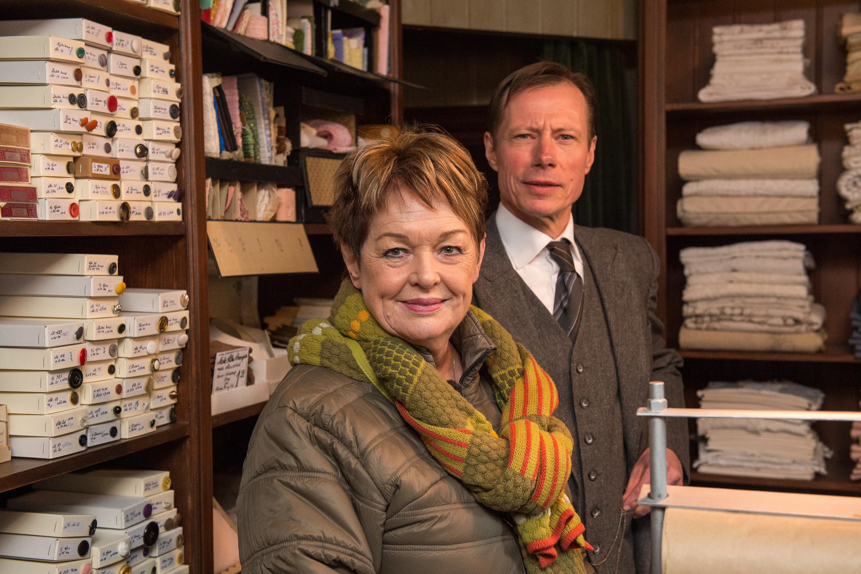 Ghita Nørby var også en tur forbi Skjerns Magasin, hvor hun mødte Mads Skjern, som han ser ud i ’Korsbæk på Bakken’s udgave. ’Korsbæk på Bakken’ er blevet til i et samarbejde mellem teltholder Torben Pedersen, DR og ’Matador’s hovedforfatter Lise Nørgaard. (Foto: © Henrik Petit, © 2016 Henrik Petit for Korsbæk på Bakken)