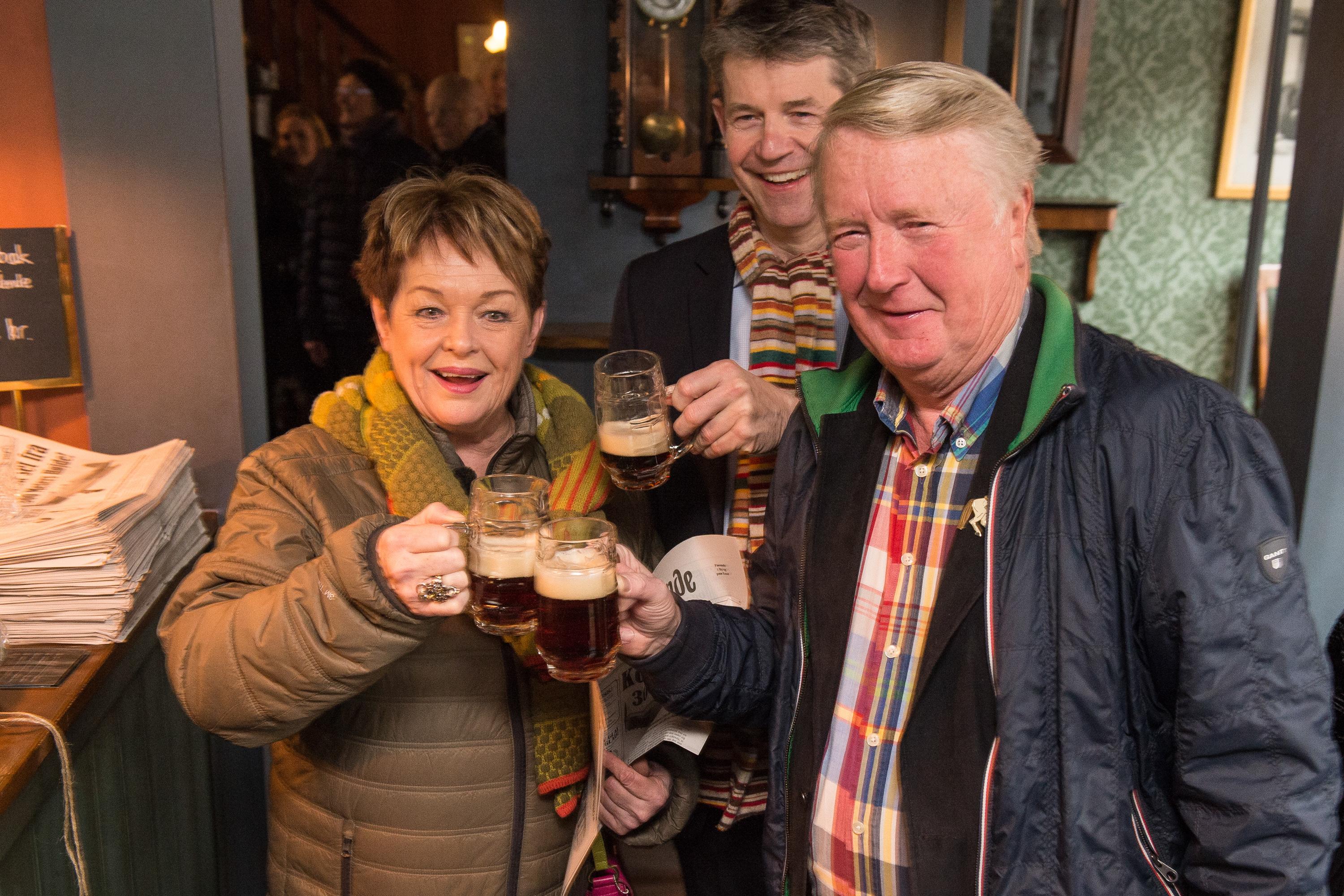 De nye udgaver af Korsbæk Tidende var lige kommet, og med i redaktionen er Lise Nørgaard, der på den måde digter lidt videre på hændelserne i Korsbæk. Her er Ghita Nørby sammen med Bakkens direktør Nils-Erik Winther (i midten) og teltholder Torben ’Træsko’ Pedersen. (Foto: © Henrik Petit, © 2016 Henrik Petit for Korsbæk på Bakken)