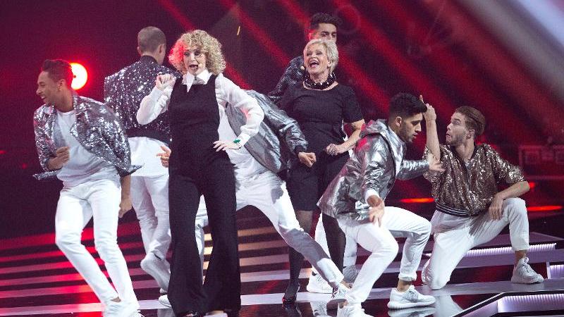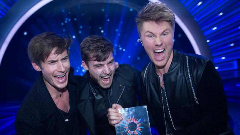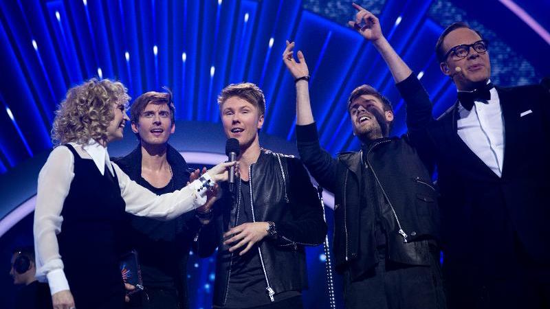 Ikke helt overraskende fik værterne Annette Heick og Jacob Riising det første interview med vinderne, der i første omgang skal synge i semifinalen den 12. maj. (Foto: © Bjarne Bergius Hermansen, Type 1)
