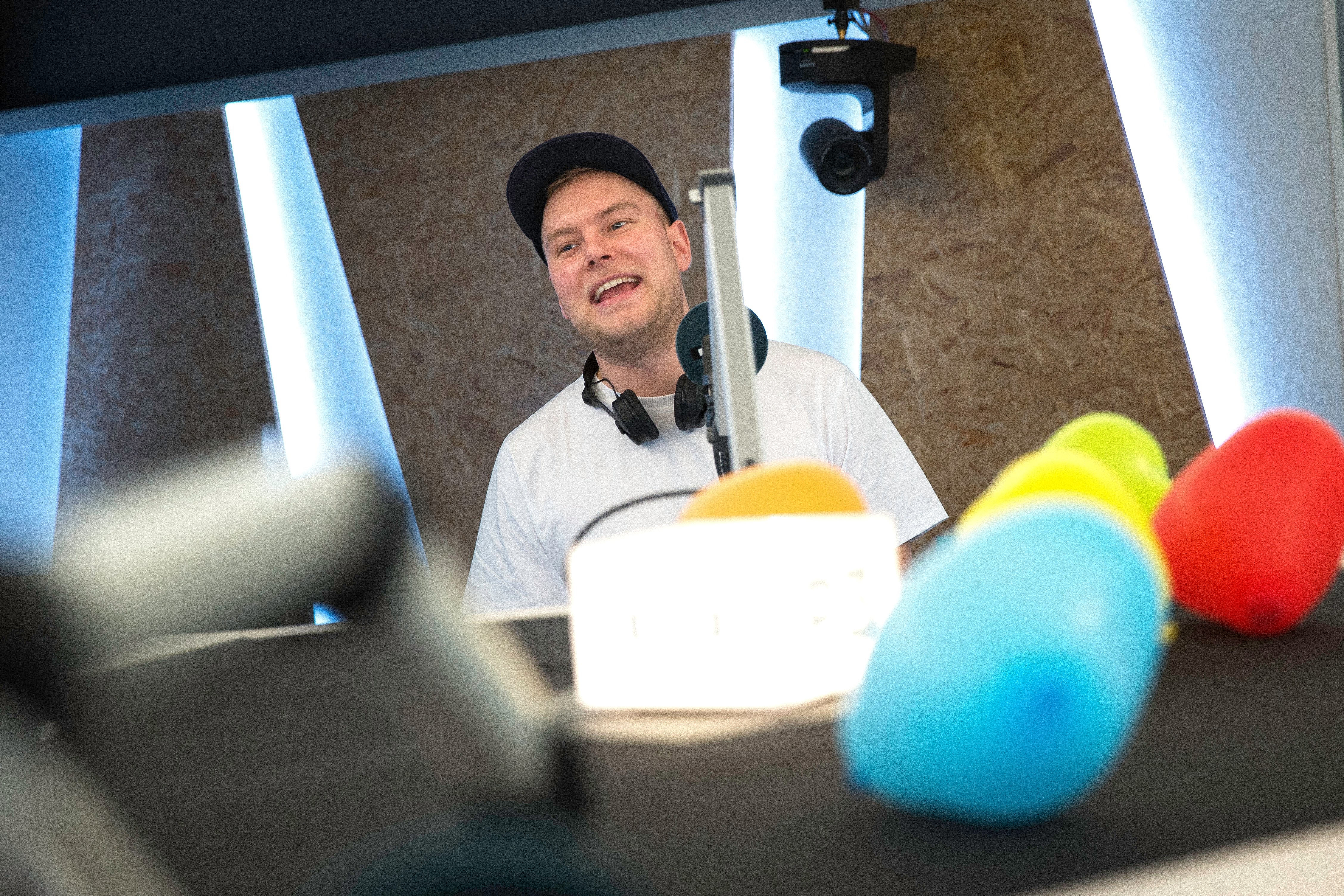 I hele denne uge skal seks P3-værter bo, sove, spise og sende radio sammen i anledning af ’Danmarks Indsamling. Her er vært Pelle Peter Jensen i strømpefødder. (Foto: © Bjarne Bergius Hermansen)