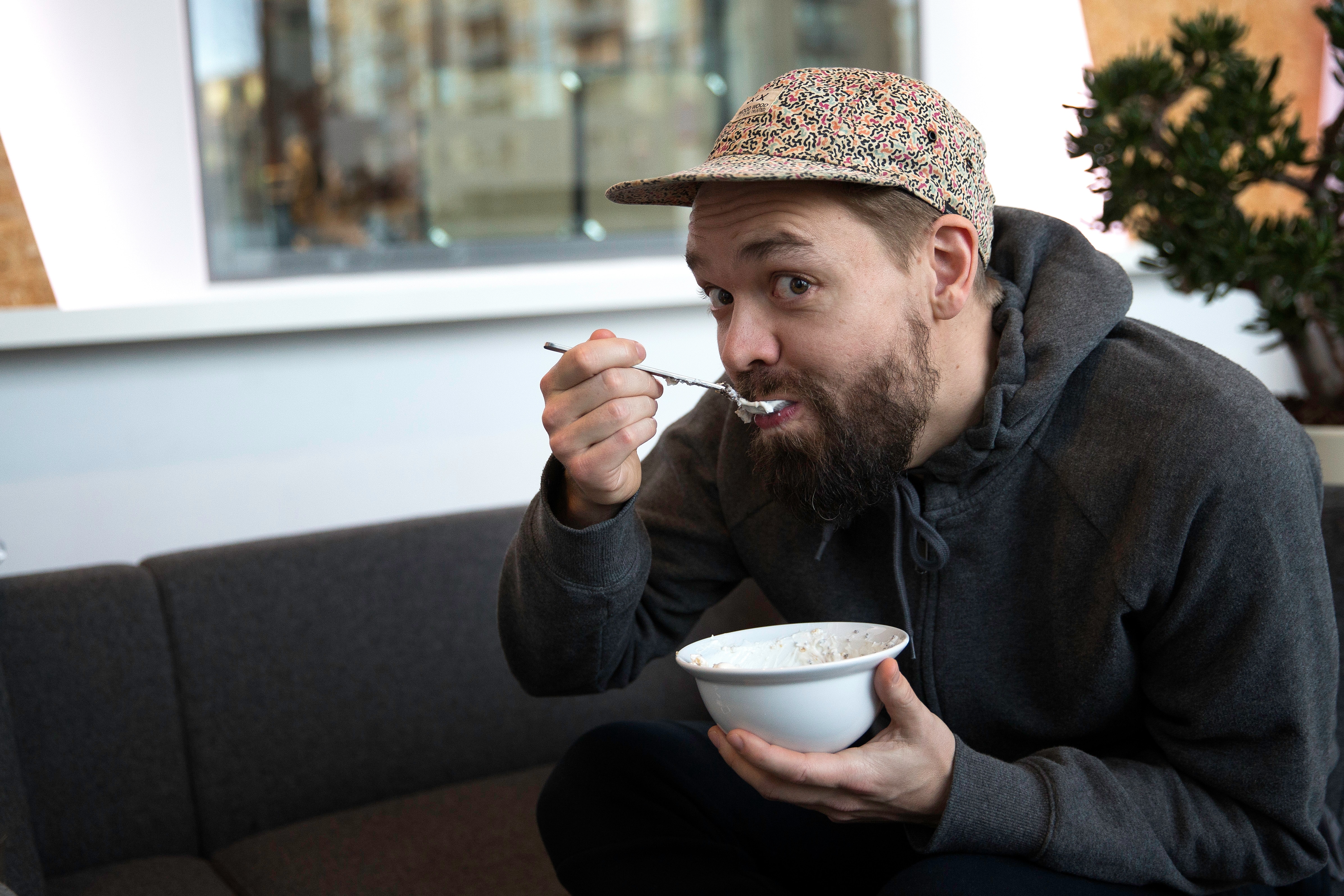 En skyrspisende Tue Blædel fortæller, at han spontant fik lokket ’Deadline’-vært Martin Krasnik i P3-studiet mandag aften. (Foto: © Bjarne Bergius Hermansen)