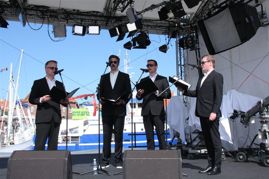 DR VokalEnsemblets herrekvartet underholdt flere steder på klippeøen. Her på DRs scene på Indermolen i Allinge. (Foto: © Torben Jensen- DR)