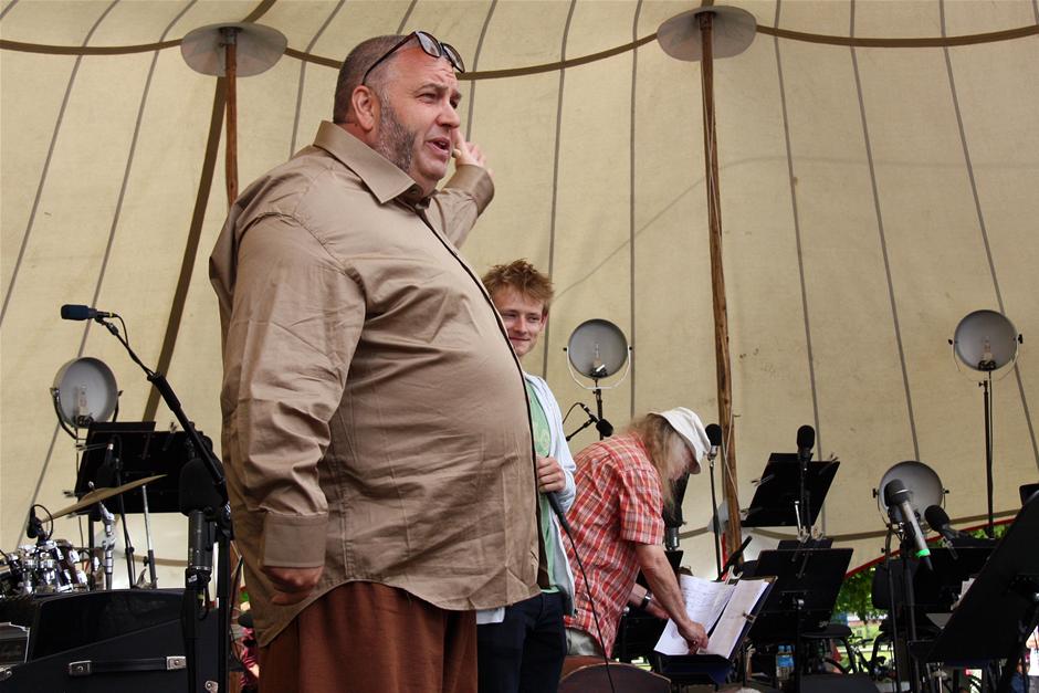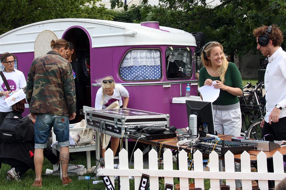 I baggrunden havde P8 Jazz stillet sin campingvogn op, og herfra gav Stine Danving og Jonas Visti lytterne et indtryk af, hvad der foregik i haven, ligesom der blev spillet musik, mens der var sceneskift og pauser. (Foto: © Kirsten Stubbe-Teglbjærg)