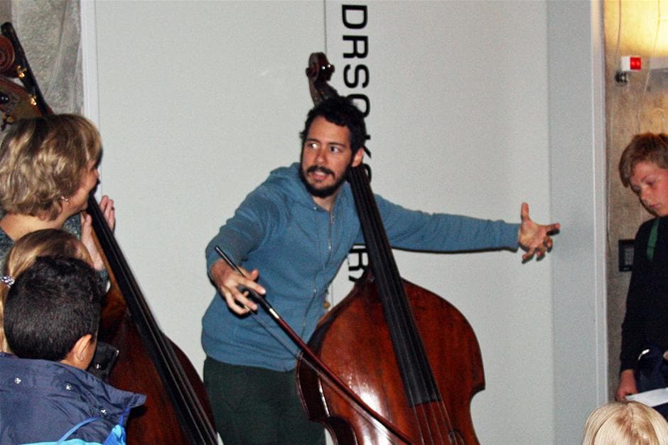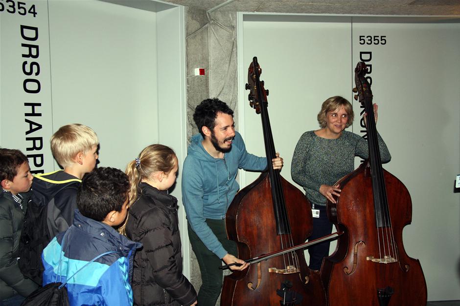 Under besøget kom børnene rundt på bagscenen og mødt nogle af musikerne fra DR SymfoniOrkestret, blandt andre bassisten José Andrés Reyes. (Foto: © Kirsten Stubbe-Teglbjærg)