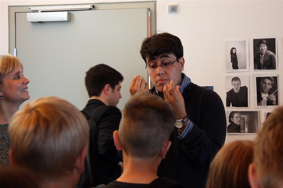 Børnene spurgte blandt andet om, hvor meget man skulle huske, mens man dirigerede - og Jesus Eduardo Uzcategui forklarede om hvordan han arbejder med balancen mellem krop, følelser og hjerne. (Foto: © Kirsten Stubbe-Teglbjærg)