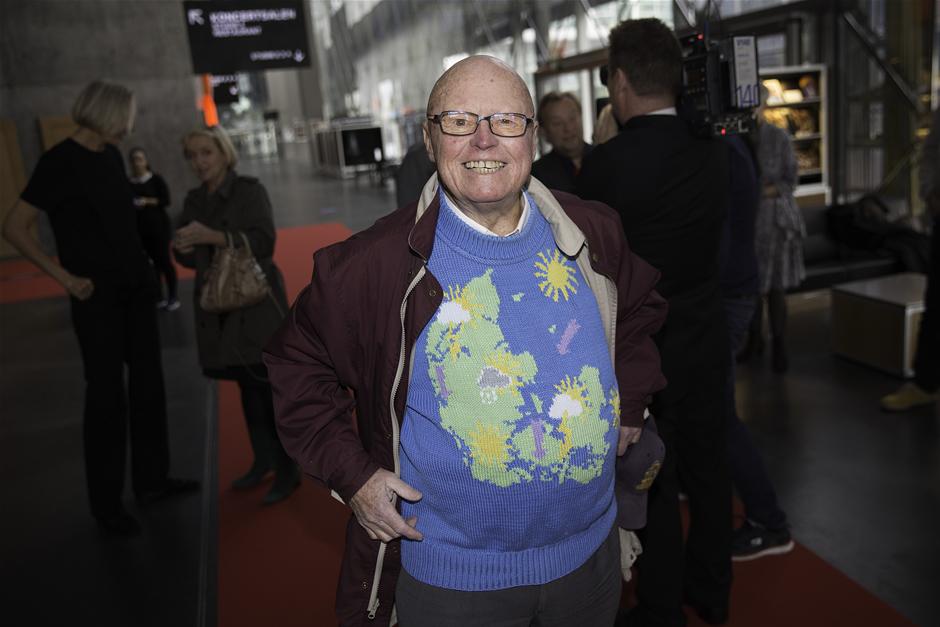 Henrik Voldborg, der fylder 80 år til marts, havde taget vejrudsigten med i trøjeform. Han var meteorolog på TV-Avisen fra 1988 til 2001. (Foto: © Bjarne Bergius Hermansen., Type 1)