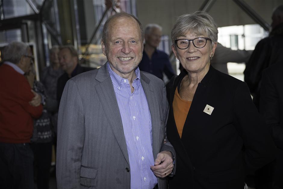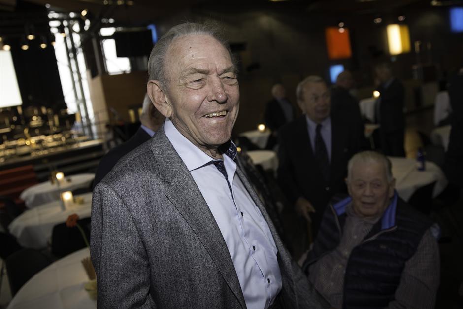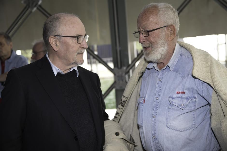 I sin videotale til forsamlingen sagde statsminister Lars Løkke Rasmussen (V), at han måske lidt savnede en Hans Bischoff på TV-Avisen i dag - én, der kan skære tingene ud i pap. Den ægte Bischoff var der - her sammen med Lasse Jensen, der lavede 'Mennesker og Medier' på P1 frem til sidste år. (Foto: © Bjarne Bergius Hermansen., Type 1)