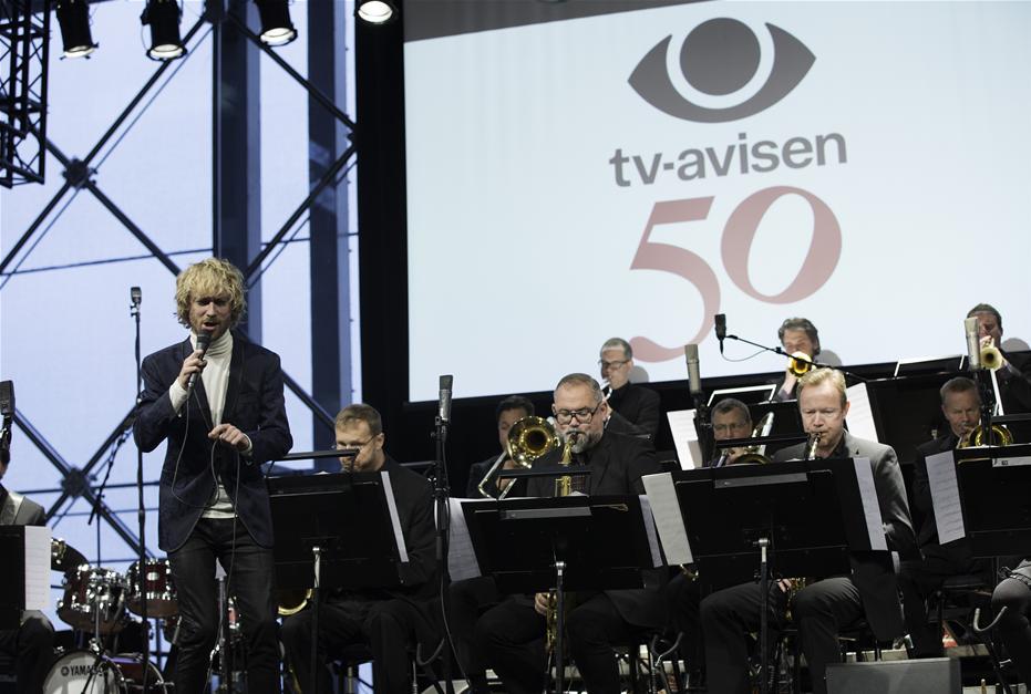 Birgit Meister og Kim Bildsøe Lassen var værter på scenen, hvor der i løbet af eftermiddagen var musik med DR Big Bandet, talere og blev vist klip fra gamle tv-aviser. De kunne fortælle, at der har været sendt TV-Avisen i 18.250 dage - lige bortset fra nogle enkelte med strejke. (Foto: © Bjarne Bergius Hermansen., Type 1)