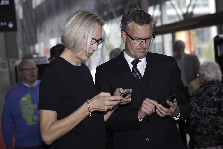 Og midt i det hele skete der så også noget, som i hvert fald ikke skete ved TV-Avisens start i 1965. DR-generaldirektør Maria Rørbye Rønn og DR-nyhedsdirektør Ulrik Haagerup skulle lige tjekke mobilen? (Foto: © Bjarne Bergius Hermansen., Type 1)