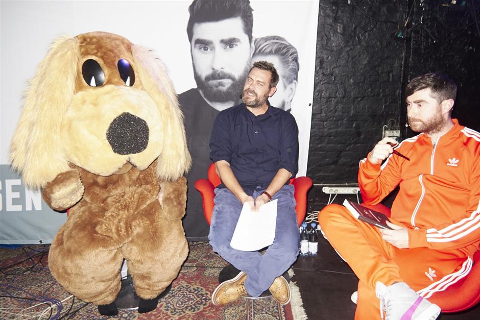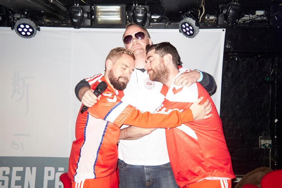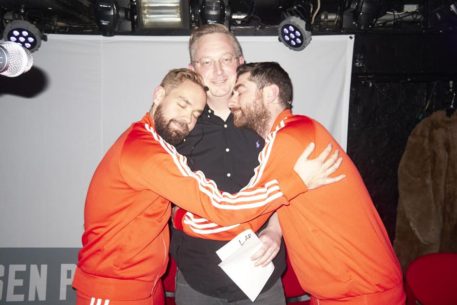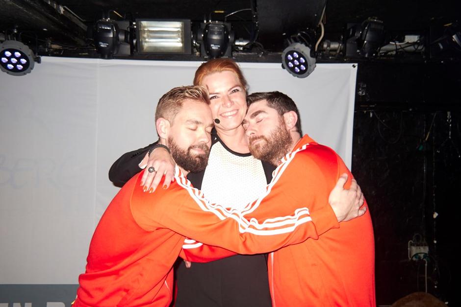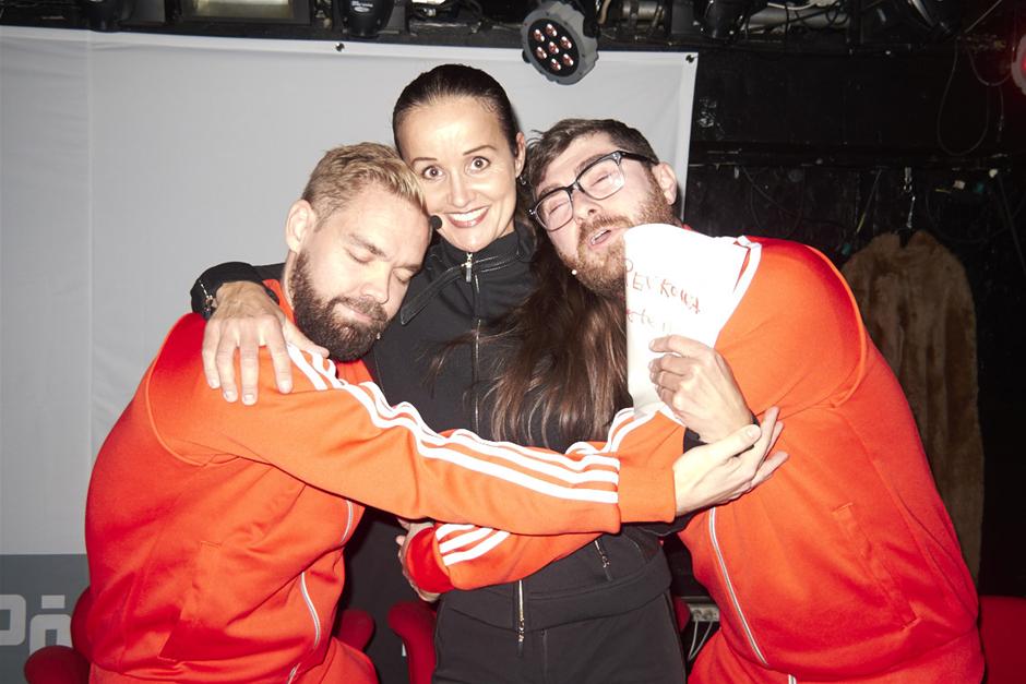 Pressen på P3 - også kendt som Tue Blædel og Tony Scott - fik sig en øm krammer med integrationsminister Inger Støjberg, da de torsdag aften trådte ud af højtaleren og mødte en del af deres lyttere i Huset i Magstræde. (Foto: © Petra Kleis)