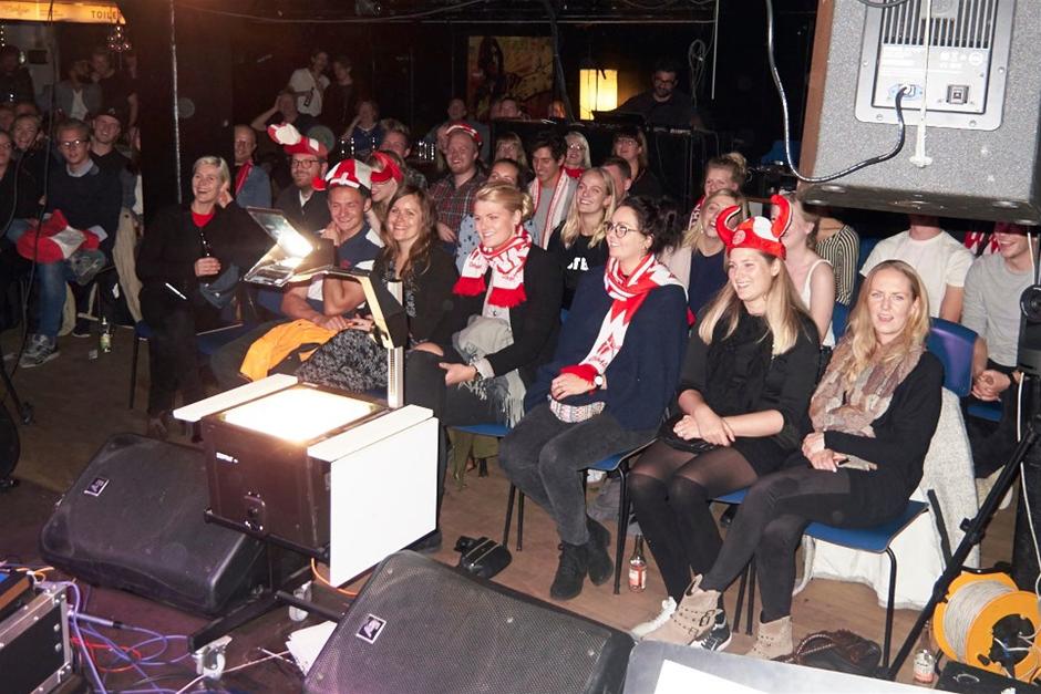 Alt imens publikum sang og råbte med - iført diverse former for roligan-udstyr. Arrangementet var støttet af DRs public outreach-pulje, hvor der er mulighed for at søge penge til live aktiviteter. Næste ansøgningsfrist er 2. december. (Foto: © Petra Kleis)